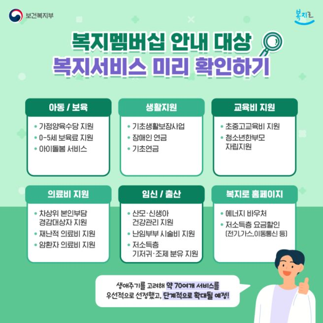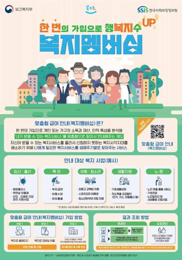 복지 멤버십은 나에게 맞는 복지 혜택을 알아서 찾아주고 알려주는 맞춤형 서비스입니다. 개인이 동의하면 소득, 재산, 가구 구성, 연령 등 개인의 사회보장 정보를 종합적으로 분석하여 받을 수 있는 복지 서비스를 예측하고, 관련 정보를 알려주는 시스템입니다.