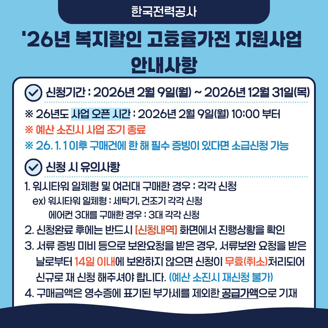 여러분, 안녕하세요~! 오늘은 정말 놓치면 밤에 잠 안 올 정도로 중요한 정보를 들고 왔어요. 바로 **'2026년 한전 고효율 가전 제품 구매비용 지원사업'** 소식인데요! 이름이 좀 길죠? 쉽게 말해서, 나라에서 정한 복지 혜택 대상자분들이 가전제품을 살 때 쓴 돈의 일부를 나라가 통장으로 쏴주는 사업이에요. 💰