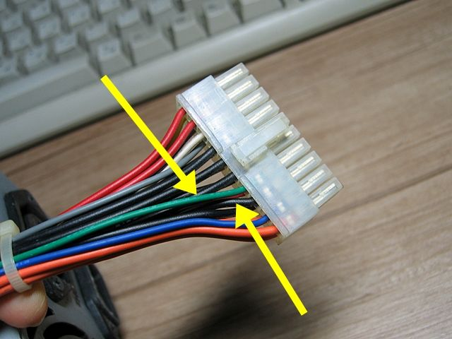 - 24핀 커넥터의 녹색 선 하나와 검은색 선 하나를 클립으로 연결합니다.