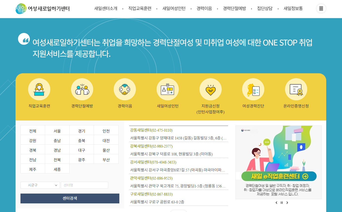 인생에서 경력은 잠시 멈출 수 있지만, 당신의 열정까지 멈춰서는 안 됩니다. 국가는 경력단절 여성들이 겪는 두려움을 누구보다 잘 알기에 새일센터라는 든든한 버팀목을 만들어 두었습니다.