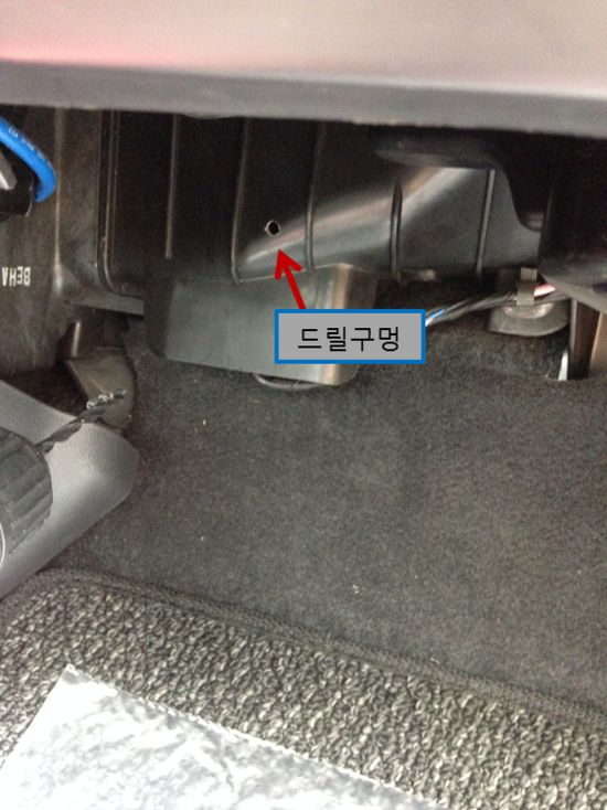 - 구멍뚫기: 블로워모터와 에바포레이터 사이에 5mm정도(세정제튜브가 들어갈 수 있을 정도)의 구멍을 뚫어 줍니다. ⚠️ 주의사항: 구멍 작업시 드릴팁이 5mm이상 들어가지않게 주의하세요. 혹시나 너무 깊이 드릴이 들어가면 에바포레이터에 손상이 갈 수도 있습니다.