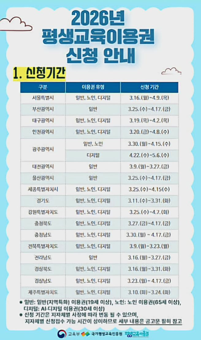 - 1. 홈페이지 '알림 신청' 설정: 장애인 평생교육 이용권 홈페이지에 접속하여 공지사항 알림 설정을 해두세요. 추가 모집 공고는 보통 1주일 내외로 짧게 진행되기 때문에 정보력이 생명입니다.